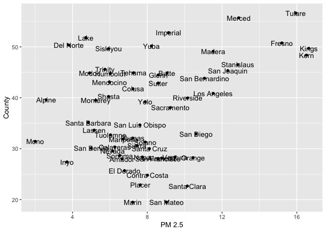 geom_point(). Here is a dot plot of the mean PM 2.5 levels